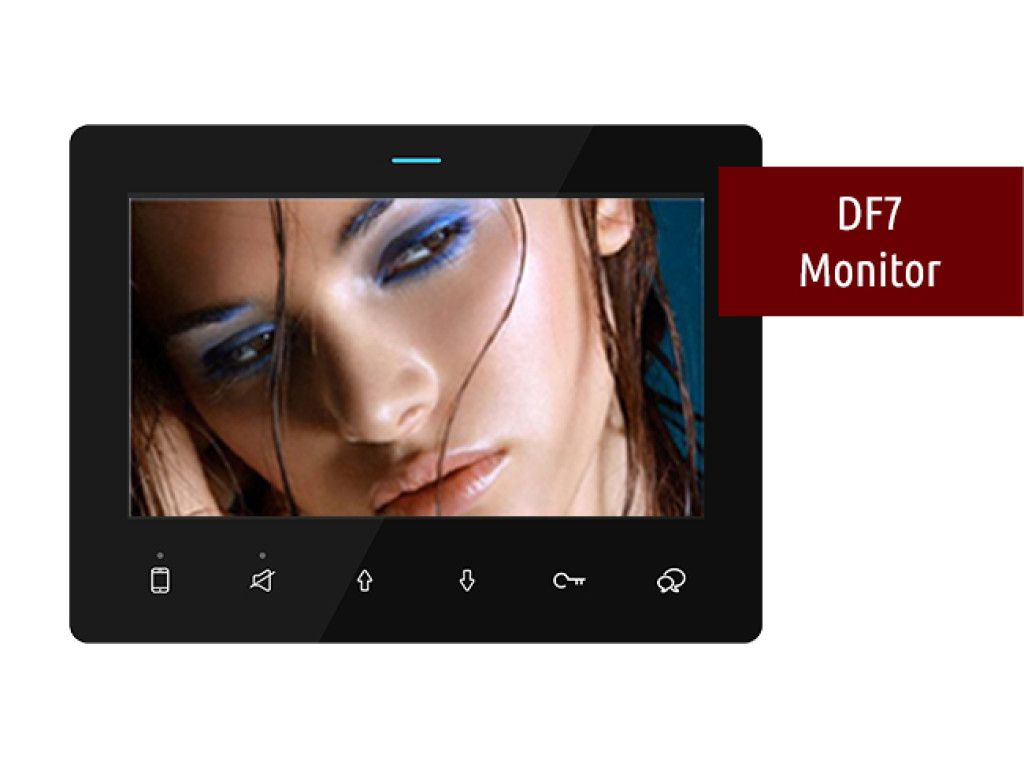 VTEK video monitor DF7 BS. Stakleni front panel.. 7″ kolor LED ekran. Touch tipke za razgovor i otvaranje vrata.Podešavanje melodije zvona i glasnoće panel/vrata zasebno. Do not disturb funkcija. Crna boja. Preporučen za manje sustave do 16 monitora.